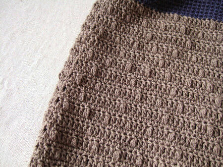 生成りの地にこげ茶の変わり玉編みバージョンと