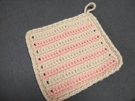 細長い平行四辺形の編み、その上辺と下辺をかがって