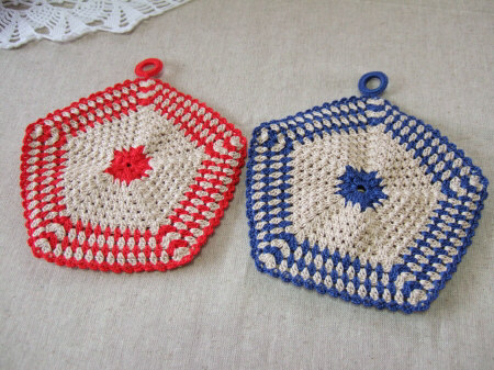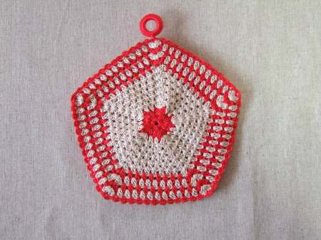 5角形のモチーフを2枚あわせたポットホルダーです。